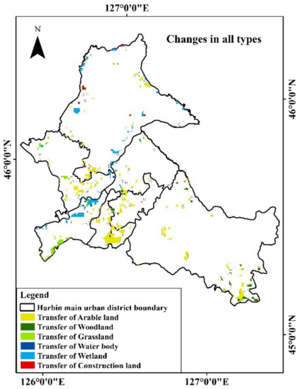 As shown in Figure 1, the LUCC in the study area were mainly arable land, mostly occurring in the vast plain area in the middle, which is currently the main development and planned development area in the urban center of Harbin and is located at the terrace on both sides of Songhua River.