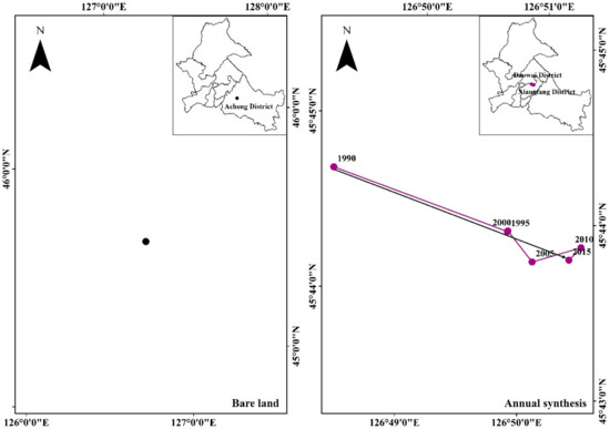 The shift of land use barycenter represents the situation in which a land pattern is used in the study area. The United States made calculations in the 1970s about the shift of barycenter of the U.S. population from the mid-19th century to the 1970s. The barycenter of land use/cover is proposed based on the barycenter theory of population distribution, which is used to characterize the spatial position and change of the barycenter in the process of land development and utilization. The position of the barycenter is generally expressed by the latitude and longitude of the map [28,29]. In this study, we used ArcGIS software to calculate and produce the figure.