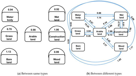 From the conversion trend between the same types, as shown in Figure 4a, the indices of arable land and woodland are 0.98 and 0.99, respectively, approaching 1, which indicates high stability. Although the change area of arable land in the study area is in the highest proportion, its base number is large and the probability of self-adjacency is high; woodland is concentrated in the southeast of the study area, with high probability of self-adjacency and low proportion of change area. Therefore, arable land and woodland have higher self-stability and lower dynamic degrees. The indexes of grassland, water body, and wetland are the lowest at 0.70, 0.94, and 0.92, respectively, indicating relatively poor stability and ease of transformation to other categories. The water body has a higher tendency index of transforming to the same type compared to wetland, because it is surrounded by wetland. At the early stage of research, the proportions of grassland, water body, and wetland in the seven types in the study area were relatively low. Although the proportion of change area is low, its dynamic degree is high, and its self-stability is poor. The index of construction land and bare land is higher than 1, which indicates that the two types are relatively stable and are less likely to be converted to other types of land use under the conditions of adjacency. During the 25 years, only 3.8% of the construction land in the research area was transferred to other types, 31.5% from other types, a net increase of about one third of the area in 1990. The area of bare land has not changed, nor has it been transferred out of or from other types.