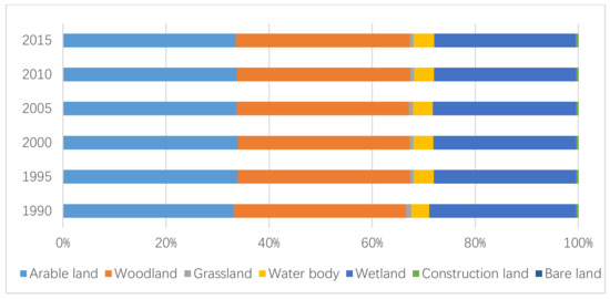 As shown in Figure 5, the value of arable land and woodland accounts for about one third in the ecosystem service system of the study area, respectively, with only a small change over the past 25 years, not more than 0.5%, and an overall increasing trend. The value proportions of grassland and water body are also not large. The highest proportion of grassland was 1.01% in 1990, and the proportion gradually decreases. The proportion of water body is less than 4%, with an overall increasing trend. Wetland occupies the third place of the seven types, with the largest change ratio decreasing by 1.09% in 25 years. The service value ratio and change ratio of construction land and bare land as non-ecological land are not large. Construction land increased by 0.1%, and bare land remained unchanged.