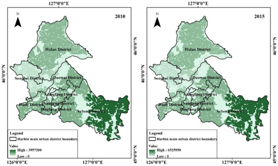 In the change of arable land, as shown in Figure 2, 73.5% of the areas converted to construction land are mostly located in Nangang district, Xiangfang district, and Pingfang district, which is due to Harbin’s “South Extension” policy. The other parts of the conversion to ecological land were due to “Grain for Green” and other policy actions such as ecological protection and land consolidation.