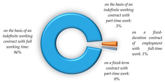 Analyzing different forms of employment and their relationship with employee loyalty, Kot-Radojewska and Timenko [] provided evidence that the employees with an indefinite duration employment contract exhibited a higher level of loyalty compared to those with a fixed-term employment contract. This relevant finding will also be included in our research, but with an impact on job satisfaction.
