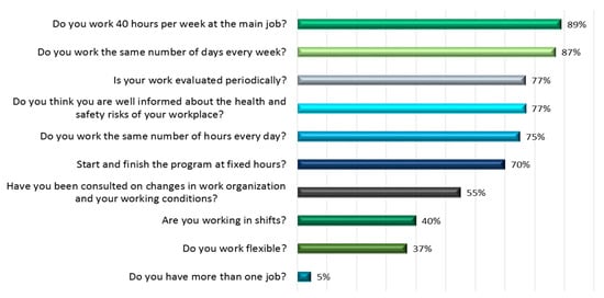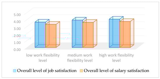 Origo and Pagani [] and Possenriede and Plantenga [] analyzed the relationship between work flexibility and job satisfaction revealing that temporary and local work flexibility requires employees’ control over their professional life, improving the link between paid work and private life, and leading to an increase in the overall level of job satisfaction. Flexible work leads to greater job satisfaction and low level of burnout and stress [], with benefits to employee health and well-being [] correlating with a good work–family relationship and high job satisfaction []. The results of these studies are of particular importance, since the relationship between work flexibility and job satisfaction is the subject matter of our research.