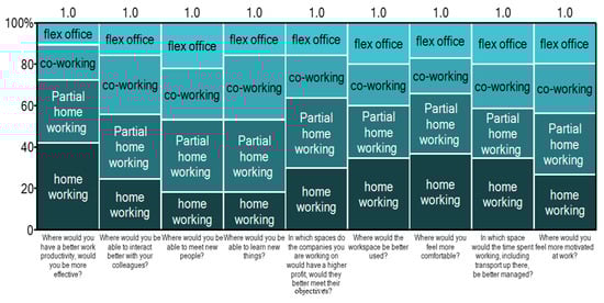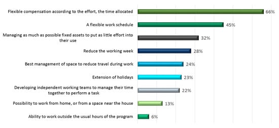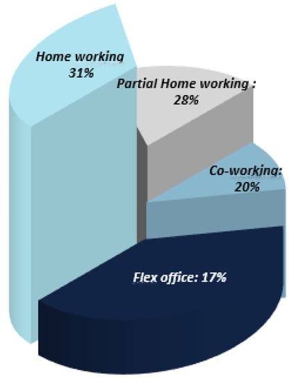 According to Mullen O’Keefe, in addition to the “when,” managers should consider if the “where” for workers can change too []. Full-time remote work is not the only solution. According to Cheremond [], the main findings of the recent Gartner poll revealed that one of the future work trends post pandemic refers to the increase of remote working, stipulating that 48% of employees most likely will decide to work remotely at least part of the time after COVID-19 compared with only 30% of them before the pandemic; flexible working will be a new normal after the virus.