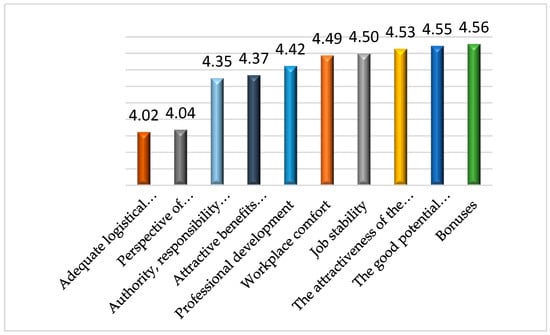 In Romania, several intrinsic factors contribute to increased job performance, resulting in employees feeling appreciated and consequently pursuing the organization’s objectives, leading to an increase in job involvement, a decrease in absenteeism, and a boost in self-confidence [] leading to fewer fluctuations regarding the job []. Additionally, factors such as self-determination [], job tability, authority, responsibility and autonomy at work, workplace comfort, advancement prospects, benefits packages, professional development, job attractiveness, remuneration [], effective communication between management and employees, early distribution of tasks, a feeling of recognition, and an attractive salary [] are also important in increasing employee performance.