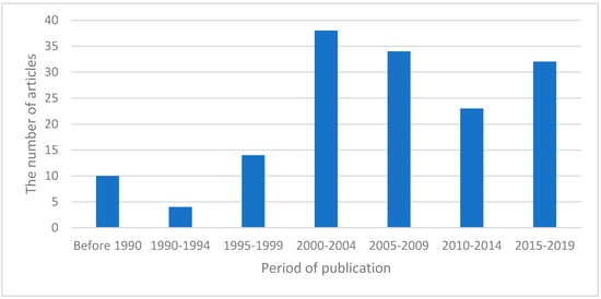 Table 1. The distribution of the journals by publication (3 and higher). - Distribution by year of publication: As can be seen in Figure 3, this shows a growing number of publications over time, with a dip in this number between 2010–2014;