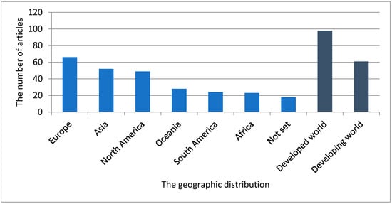 Figure 3. The distribution by year. - Distribution by geographical area of focus: Figure 4 shows the geographical distribution. In general, approx. 62% of the articles focused on the developed world, and 38% had a focus on the developing world (based on the UN DESA Country Classification [];