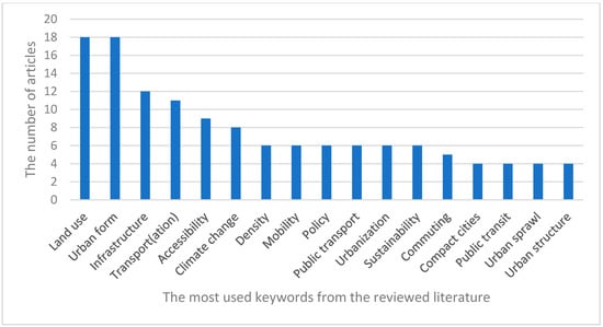 - Based on the keywords per article in Step 3, the articles were sieved based on their fit in the scope of the paper. This sieving was based on 18 indicators, which were derived from the listed key words in step 3, which stress the topic(s) of the reviewed papers. These indicators were land use, urban form, infrastructure, transport, accessibility, climate change, density, mobility, policy, public transport, urbanization, sustainability, commuting, compact cities, public transit, urban sprawl, and urban structure.