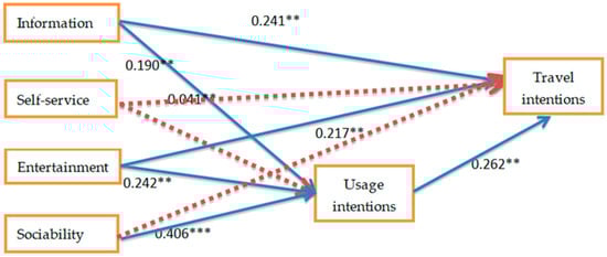 Entertainment motivation (0.217) exerts a positive influence on travel intentions. H7 was validated, in line with previous research by Chiu and Yang [86]. Usage intentions influence travel intentions (0.262), so H9 was also validated. Thus, entertainment ultimately influences users’ travel intentions, but this influence is fully mediated by usage intentions, matching the findings of Huang (2008) [28]. Unlike previous findings by Aluri et al. (2016) demonstrating that sociality affects behavior intentions [87], this result shows that sociality does not affect the user’s travel intentions, which does not support H8. Nevertheless, travel intentions can be effectively reinforced by enhancing the amusement and entertainment facilitated by WOAs.