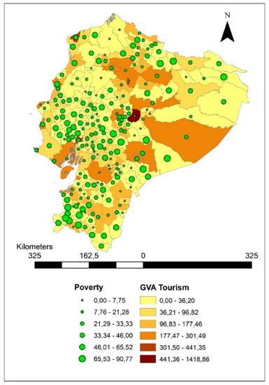 Poverty is one of the main indicators of economic development worldwide, in such a way that one of the Sustainable Development Goals is to eradicate poverty in all its forms worldwide. The objective of this research was to examine the effect of the gross value added (GVA) of tourism on poverty in the 198 contiguous Ecuadorian cantons. The methodology used was the application of a set of spatial econometric models to capture the regional effect of tourism on poverty. Data were obtained from the Central Bank of Ecuador and the National Survey of Employment, Unemployment and Under-Employment of the National Institute of Statistics and Census (INEC). The results show that tourism activities and regional poverty are negatively related; thus, a 1% increase in tourism-related economic activity decreases the regional poverty of the canton itself by 4.31%, and that of neighboring cantons by between 0.7% and 2.4%. The inclusion of the control variables shows that schooling and the mestizo population contribute to reducing the canton’s poverty, since the regions with a high GVA of tourism have high levels of schooling and a mestizo population. Thus, regional poverty increases when the level of schooling increases in neighboring cantons. On the other hand, in cantons with a high Mestizo population, compared to the African-American population, the poverty of the canton and its neighboring regions decreases. Public policy measures which aim at reducing poverty must take into account spatial spills from tourist activity in the cantons.