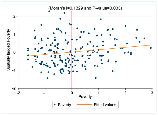 The second part of the econometric strategy was to estimate spatial models that allow for the capture of the effect of geographic contiguity. The I-Moran test (0.1329) indicates the presence of spatial autocorrelation at the significance level of 5%. The economic dynamic is highly related to geographic space, even more when it is strengthened according to the location of economic resources. Authors like Fischer and Griffith [79] suggest the application of spatial analysis to study the spatial spillovers of economic phenomena. The first model to be estimated was the spatial autoregression model (SAR), which was used to analyze how the poverty of one region is affected by that of contiguous regions. Following Anselin [80], the model is proposed as follows: