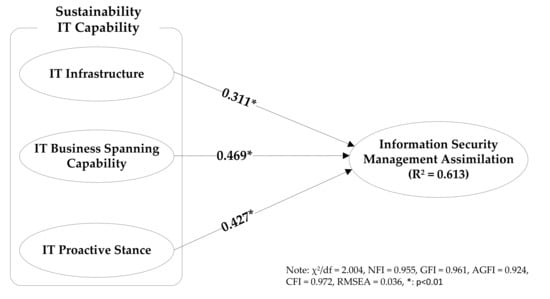 | H2 | IT Business Spanning Capability → Sustainable Information Security Management Assimilation | 0.469 * | 7.483 | Supported |