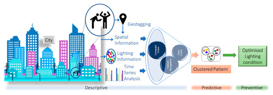 The second section can be defined as predictive, to be informed by the descriptive analysis of real-world events within the city space and the relationships between factors responsible for them. Pattern recognition is the process of recognizing patterns by using a machine learning algorithm. It is the ability to detect arrangements of characteristics or data that yield information about a given system or data set. Cheng 2012 described data fusion as the process of integrating information from multiple sources to produce specific, comprehensive, unified data about an entity [101]. The recent advances are described elsewhere [102]. Building on the knowledge from retrospective data gathering as well as real-time data gathering using computer vision, pattern recognition and data fusion, the purpose of the predictive analysis is to support the stakeholders of a sustainable city to make an informed decision, which can be further extended to automate such decision-making.