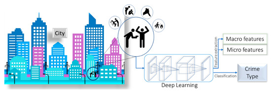 The spatial investigation will start with deep-learning-based CV to extract the features, where a feature is an individual measurable property or characteristic of a phenomenon being observed (Figure 2). The objective of the framework shown in Figure 2 also includes automatic categorization of a crime scene. Once trained (the training process involves finding a set of weights in the network or machine learning model that proves to be good, or good enough, at solving the specific problem), the predictive model should be able to correctly speculate from a real-time scene if a crime is happening and the required alert level of the crime, as suggested in Figure 2.