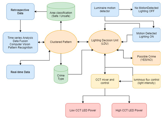 In the clustered pattern section (Figure 1), processing of the real-time data takes precedence since it defines the possible criminal actions. For example, if a metal object in the CV real-time data is correlated with a possible pattern of a knife or gun part and knowledge-base and geotagging data indicate a crime-prone area, then the possibility of a crime happening is high and the area lighting is signaled to elevate to its full intensity and higher CCT and CRI, so as to make identification easier and provide an alert status.