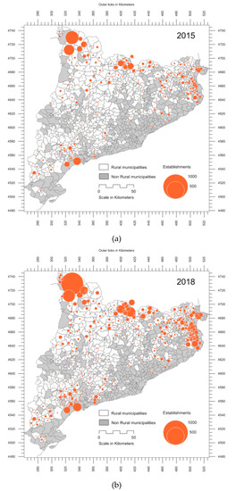 Evolution of VUTs in Catalonia’s rural municipalities: (a) 2015; (b) 2018. Source: Maps created by the authors using data from Registre d’Habitatges d’ús turístic de la Generalitat de Catalunya and cartographic databases from the Cartographic and Geological Institute of Catalonia.