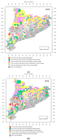 Evolution of the position of VUTs (number of beds) in relation to all other types of accommodation in the rural municipalities of Catalonia: (a) 2015; (b) 2018. Source: Maps created by the authors using data from Registre d’Habitatges d’ús turístic de la Generalitat de Catalunya, Catalonia’s Statistics Institute, and cartographic databases from the Cartographic and Geological Institute of Catalonia.