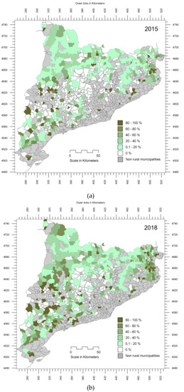 Evolution of the VUT tourist function rate in the rural municipalities of Catalonia: (a) 2015; (b) 2018. Source: Maps created by the authors using data from Registre d’Habitatges d’ús turístic de la Generalitat de Catalunya, Catalonia’s Statistics Institute, and cartographic databases from the Cartographic and Geological Institute of Catalonia.