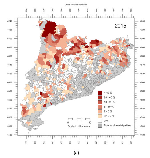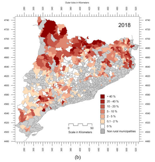 Evolution of Relative weight of VUTs (number of beds) within the whole supply of accommodation in the rural municipalities of Catalonia: (a) 2015; (b) 2018. Source: Maps created by the authors using data from Registre d’Habitatges d’ús turístic de la Generalitat de Catalunya, Catalonia’s Statistics Institute, and cartographic databases from the Cartographic and Geological Institute of Catalonia.