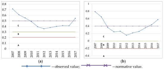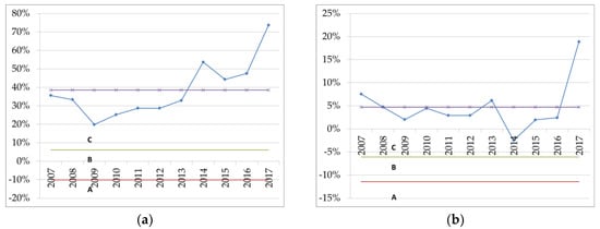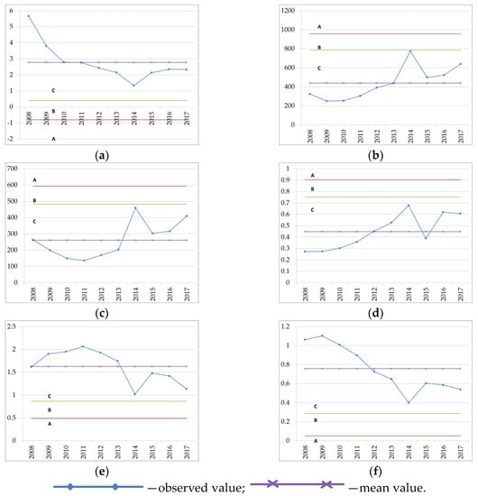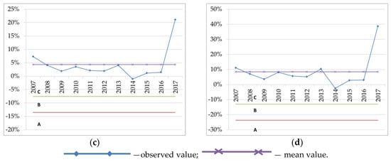For business activity indicators that do not have an established standard, the middle line is determined on the basis of the arithmetic mean (Figure 3). Most of the indicators until 2014 had a negative trend and in 2014 they became closer to sector B, i.e., the pre-crisis state. However, this situation cannot be called critical, because according to the Shewhart’s methodology, the tendency becomes apparent during five or six observer points.
