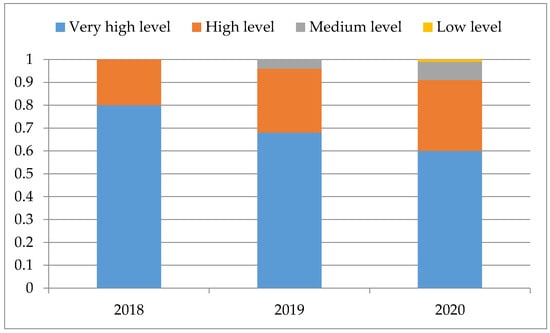 The obtained transition matrices define the probabilities for switching among the financial security levels. Note that we used the three scenarios when defining these matrices. The resulting transition matrices can be applied to predict the future level of financial security in n years. In our case, we control for data up to year 2017 (Table 3). Therefore, the forecasts are available for year 2017 + n. First, we define the probabilities of switching from the very high financial security level () considering 2017 as the reference point. The following row vector directs the forecast:
