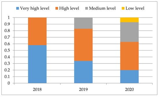 The pessimistic scenario assumed either the stability or the decline of the sector. The resulting probability of maintaining a very high financial security level in 2020 is much lower (0.20) if contrasted to the other two scenarios (Figure 7). The highest probability corresponds to a decrease in financial security to the high level (0.43). A decrease in financial security to the medium level is possible with probability of 30%. Finally, the probability of the pre-critical situation is 7% (for 2020).