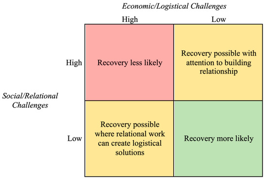 To assess the overall likelihood of successful agricultural food recovery in different contexts, one might use a matrix such as that displayed in Figure 1. Figure 1 displays the intersection of two dimensions of agricultural food recovery that emerged from the interviews: economic/logistical challenges and social/relational challenges. The likelihood of success diminishes when stakeholders encounter significant challenges within either the logistical/economic or social/relational domain, and the least likely scenarios are when both types of challenges are significant. However, our data suggest that neither logistical nor relational challenges are necessarily static. Instead, they can shift to reflect changes in stakeholders’ social relationships and/or logistical constraints.
