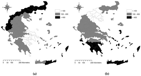 Population redistribution over wider regions was evident in Greece since the late 1990s, reflecting spatially heterogeneous socioeconomic transformations increasingly decoupled from traditional geographic gradients (e.g., urban–rural, coastal-inland). Since the 1990s, population increased in rural districts and low-density touristic coastal areas, especially large and medium-sized islands, as well as lowland, internal districts devoted to intensive cropland. More intense urban-to-rural internal movements were specifically observed in the last decade as a result of progressive counter-urbanization and shrinkage of central cities associated with worse socioeconomic conditions in metropolitan regions, mainly in Athens and, partly, Thessaloniki [13,32,90]. However, the overall impact of these processes on the Greek urban hierarchy was rather modest [21]. In such a context, the possible role of unregistered or partially registered (i) emigration abroad and (ii) illegal international immigration should be evaluated further.