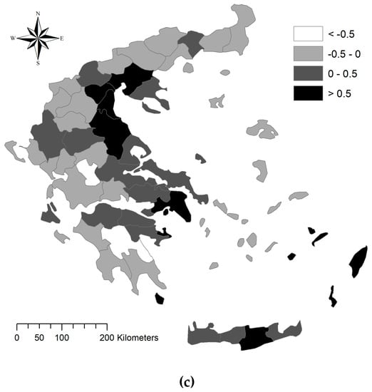 As a result of economic processes and mixed socio-demographic contexts, spatial heterogeneity in population growth rates was persistently observed in both urban and rural districts. However, this process was clearly asymmetric over time, being more intense in the second time interval (1980–2019) corresponding with late suburbanization, counter-urbanization and early re-urbanization and less intense in the first time interval (1940–1980) corresponding with urbanization and early suburbanization in Greece. Tapia et al. [91] investigated population trends in Spain at different time windows between 1860 and 1991 with the aim at testing if population at the beginning of each time window affects population growth during the same time window. According to the authors’ results (p. 81) “while such a relationship between these two variables hardly existed during the second half of the nineteenth century, this link increased significantly between 1910 and 1970, although this trend was abruptly interrupted by the Civil War and the autarkic period that followed [92,93]. The intensity of this relationship decreased in the 1970s, a process that continued during the 1980s (…); agglomeration economies were stronger in medium-sized districts, especially from 1960 onwards”.