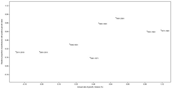 Relationship between the percent annual rate of population growth (%) in Greece and the relative proportion of prefectures with positive growth rates.