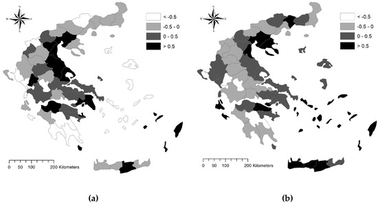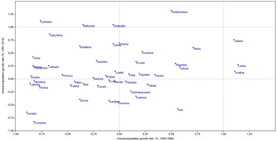 By partitioning the investigated period in two-time windows, Figure 3 illustrates a substantial similarity in the geography of population expansion in Greece. Positive rates were observed in prefectures along the Aegean side from Macedonia to Crete, being more intense during 1940–1980 and less intense during 1981–2019. Marginal prefectures in Central Greece and Peloponnese have totalized the highest decrease in the country. A total of 18 prefectures (including Attica and Thessaloniki) were classified in the lowest right quadrant of Figure 3, indicating higher growth rates during 1940–1980 than during 1981–2019.