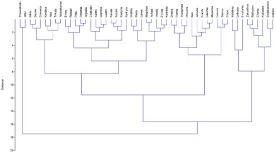 Hierarchical clustering (Ward’s agglomeration rule, Euclidean distance) classifying Greek prefectures on the base of long-term population dynamics.