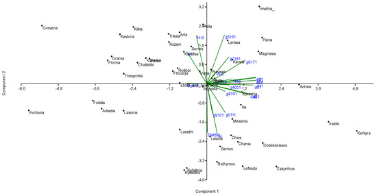 A hierarchical clustering (based on Euclidean similarity matrix under Ward’s amalgamation approach) was run on a database constituted of population growth rates with the aim at classifying temporal units (years) and spatial units (prefectures). Assumed as a relevant dimension of demographic resilience, similar spatiotemporal structures characterize long-term population trends. Persistence (or change) in specific demographic trends was considered indicative of different background conditions. A principal component analysis (PCA) was carried out on a collection of variables including (i) population growth rates at eight decades, (ii) population density at the beginning of each decade and (iii) the remaining eight contextual variables (Section 2.3) at each prefecture. PCA was aimed at containing redundancy, evaluating changes over time in the multivariate relationship between variables at the same time. The PCA characterized research dimensions and distinctive demographic structures in Greece. components with eigenvalue > 1 were selected according to the results of the spectral decomposition of the correlation matrix [70]. The latent structure of variables and prefectures was finally illustrated adopting a biplot that depicts component loadings and scores. Multiple linear regression models were run for each decade and identified the predictors most associated with population growth in Greece. For each decade, predictors include the variables described in Section 2.3 and were standardized before analysis (e.g., [29]). Model’s goodness-of-fit was estimated via adjusted R2 tested for significance (against the null hypothesis of a statistically insignificant model) at p < 0.01 using a Fisher–Snedecor F statistic. Slope coefficient estimates and the related significance level at p < 0.1 were reported testing for the null-hypothesis of statistically insignificant coefficient based on a Student’s t statistic.