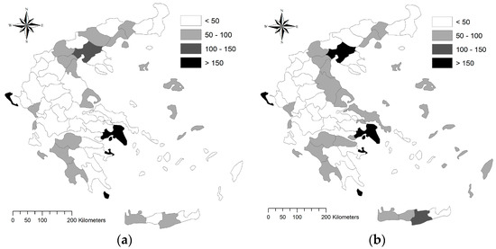 Being partitioned in 51 districts (‘nomoi’ or prefectures) corresponding to the Eurostat NUTS-3 level, Greece (131,982 km2) coincided with the area investigated in the present study. Prefectures in Greece are a sufficiently detailed administrative spatial level to evaluate changes in population distribution as a function of socioeconomic transition (Figure 1). The regions of Athens and Thessaloniki concentrate nearly 50% of the Greek population [66,67]. Medium-sized cities (Iraklio, Patras) and prefectural head towns (e.g., Larisa, Volos, Kalamata, Chania, Kavala, Ioannina) grew substantially [27,32]. By displaying population dynamics contrasting with what was characteristic of tourism-specialized districts in the Aegean region, marginal districts experienced diffused land abandonment, depopulation and economic decline [68].