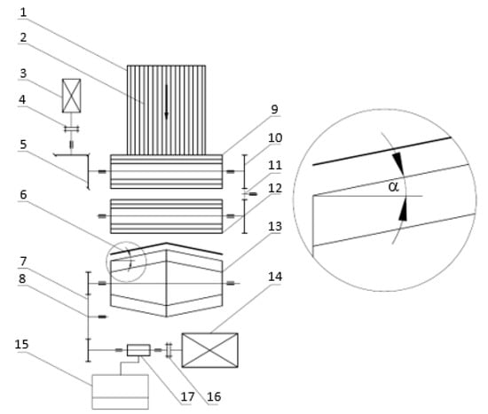 Figure 1. All the essential assemblies of the test bed are fastened to the frame bearer made of steel sections. Power transmission from the electric motor (14) through coupling (16) is transferred to the measurement system of the turning moment and rotational speed (17) and then to the gear belt transmission (7) and directly to the cutting drum (13) of a cylindrical or truncated cone type. The belt transmission (7) has the tension roll (8). The crosscut edge (6), made of steel flat bar, is also replaceable and it is used geometrically (straight or broken section) for a given shape of a cutting drum. Material to be cut (2) is fed in the form of sheaves to a trench (1). It is pressed and pulled in by the pulling-crushing rollers: the upper (9) and bottom one (12). The cutting speed of the plant material is regulated by the rotational speed of the electric motor’s shaft (14), rotations of which may be changed with an inverter (a frequency converter). The degree of the material’s layer compaction is regulated by a change of a gap between the upper (9) and bottom roller (12). Power transmission to the rollers is transmitted from the electric engine (3) through a coupling (4) and bevel gearbox (5). Revolutions of the electric motor (3) may also be changed by an inverter (a frequency converter). However, the drive between the rollers (9) and (12) is realized with the use of the stretcher, which makes it possible to change the gap between the pulling-crushing rollers. It is enough to lower the upper roller (9) by unscrewing the clamping screws and then screwing them in a determined position by the chaff cutter’s service staff and shifting the roller (11), tightening the cogbelt. The cutting angle, in the case of a conic cutting drum, is regulated with the use of replaceable shields on the drum’s roller and an appropriate adjustment of spherical joints that the cutting knives are fastened to.