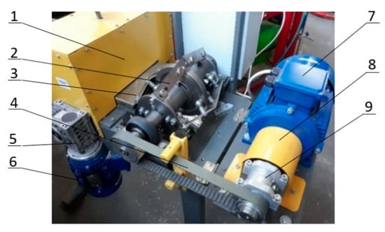 Figure 2 presents an exemplary construction of a cutting drum of the conic type assembled in a chaff cutter, together with the engine driving it via belt transmission of toothed type. Thus, the design of the test bed guarantees the conducting of experimental tests concerning the plant material’s layer cutting process while exercising the assumed values of independent variables.