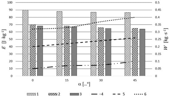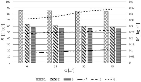 E have, in each case, been received for the cutting angle α = 45°. This results, most of all, from the fact that the material is cut along its longer length at the same feeding width and thickness, which, as an effect, results in obtaining higher effectiveness for the