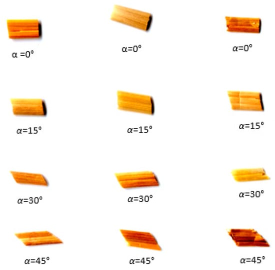 Figure 10 presents the exemplary photographs of cut pieces of plant material (chaff) at different cutting angles α. A detailed analysis of chaff makes it possible to establish that the change of the cutting angle α has an impact on the chaff’s shape and its length. The conducted measurements of the real chaff’s length have proved that it is from 8% to 13% shorter than what results from theoretical calculations.