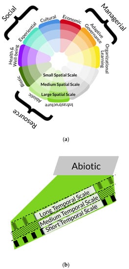 While social and ecological systems are independently complex, interactions across SES tend to compound complexity []. Each system encompasses diverse and interrelated components []. Complex systems may form nested hierarchies with emergent properties from lower-level interactions, resulting in higher-level patterns influencing subsequent interactions [].