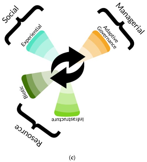 Adaptive governance requires recognizing change as continuous and unavoidable []. Flexible management strategies can help institutionalize approaches to change by incorporating SES and scale-explicit management approaches []. Although organizational capacity may require simplifying SES (e.g., focusing on one policy area at a time), adaptive management recognizes institutional flexibility, openness to fresh ideas, acknowledgement of policy failures, and grounding on long-term considerations as approaches to complex systems management []. It also emphasizes clear responsibilities and leadership [,] and experimental learning to reduce uncertainty [].