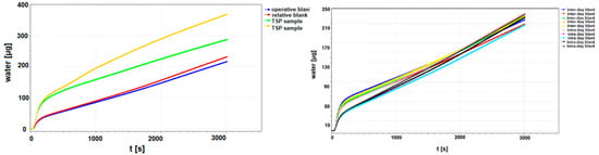 In the left panel of Figure 6, we present examples of the KF titration curves obtained while analyzing real TSP samples collected in Warsaw (before blank sample subtraction). Most of the analyzed samples had very similar profiles with a single peak in the time range 0–500 s. Some of them however (like in the case of the sample featured with red line), show some different thermal profiles including two peaks. Those two water contributions were observed over 0–500 s and 700–1100 s of the extraction time. Such a profile was most almost identical to the one typical for Al2O3 and inorganic carbon water release (Figure 7).