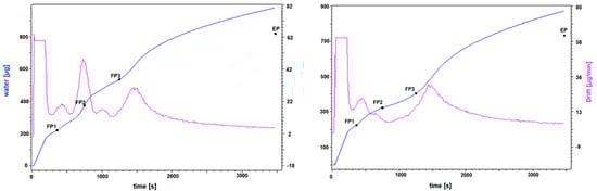 The analyses were performed in a ramp function, which allows to set heating ramps. To compare water release curves between real PM samples and selected PM compounds, the same ramp program in the range of 50–180 °C was used for each measured sample. The thermal steps used in this work were published previously in a few studies regarding the qualitative detection of water presence in PM samples [11,29]. In this work, the following thermal ramp process was used: 5 min at 50 °C (1st heating block; FP1); from 50 to 120 °C at 14 °C/min (2nd heating block); 5 min at 120 °C (FP2) from 120–140 °C at 12 °C/min (3rd heating block); 2 min at 140 °C from 140–160 °C at 14 °C/min (4th heating block), from 160–180 °C at 14 °C/min (5th heating block), and 20 min at 180 °C (6th heating block; FP3), adjusted to PTFE filters. Normally, titration to dryness in single heating block is communicated by obtaining low drift (usually <10 μg H2O/min). When the original stable drift value is reached, titration stops and the end point value is displayed. Some modifications were made to the default settings regarding identification of the end point value with an aim of further titration in the 2nd–6th heating blocks. When using the thermal ramp function it was necessary to exclude the end point identification, signaled as the return of the drift to its baseline value. Therefore, the minimum value of the difference between the indicator platinum electrodes was set at 30 mV, and the limit value of the drift was set at 1 µg/min. The total extraction time was significantly elongated to 3000 s. Some modifications were also made regarding subtraction of the blank water contents from those found in the measured samples. The software automatically calculates the amount of released water by subtracting the baseline drift value from the final water contents, where the baseline drift is extrapolated by multiplying its initial value to the end of the analysis. As a consequence, an elongation of the analysis (extraction time) to 3000 s increases the drift contribution to the final water contents in measured samples. To achieve the best accuracy of results and reduce the influence of moisture conditions inside laboratory room, the operative blank measurements were carried out after each 4th sample and the final water contents were calculated by subtracting the blank water contents from each point of the water release curve, as presented in Figure 2.