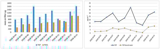 Figure 4. (Left) diurnal mass of TSP and particulate matter (PM)1 collected on filter media. (Right) concentrations of TSP and TSP-bound water µg/m3 at Warsaw urban background station.