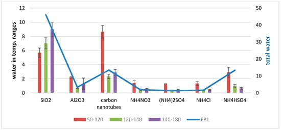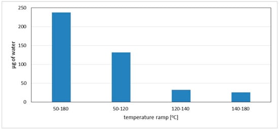 In most cases, the only water contribution in the case of real TSP samples was found in the range 0–500 s, and this water contribution can be described as loosely bound water—mostly the moisture present as water vapor. The average amount of water in this step (calculated on the mass basis) was on average 130 ± 102 µg, while under the next temperature steps (120–140 °C) and (140–180 °C), the amount of water release increased for just about 41 and 38 µg, respectively. This strictly suggests that TSP moisture is released to the greatest extent in the first temperature step, followed by the 120–140 °C temperature range.