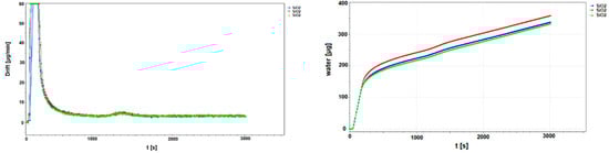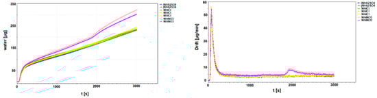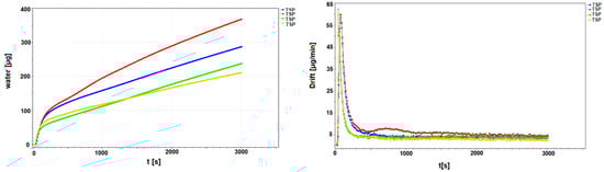 Figure 6. Water release curves (water µg) for real TSP samples and their drift profiles (µg·s−1) over water extraction time (s).