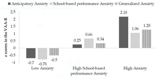As shown in Figure 1, the first group included 609 participants (52.45%) with low scores in the three factors. This group was called Low Anxiety. The second group classified 462 participants (39.79%) with high scores in SA and moderate scores in AA and GA, so it was called High School-based Performance Anxiety. Finally, the third group, which was named High Anxiety, consisted of 90 participants (7.75%) characterized by high scores in the three factors.