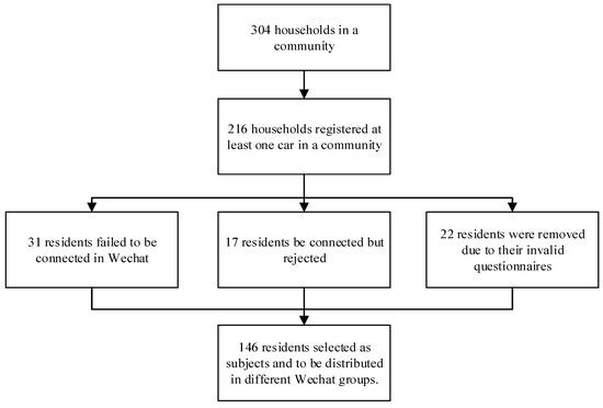 One community in the urban area of Hefei city was randomly chosen. In order to find car owners, we cooperated with the residential property management company and asked the property manager to provide the house and telephone numbers of the residents who had already registered at least one car. Then we connected the car owners through WeChat using their telephone numbers which are an essential way to register WeChat identifications. Once approved, a self-introduction was sent to explain the purpose of our efforts. The respondents were asked to fill in a questionnaire and would receive ¥5 immediately after finishing the questionnaire truthfully. At the top of the questionnaire, respondents had to fill in their house number. It was designed to test people’s honesty and the validity of their answers. If there was an information mismatch between the respondents and the residential property management company, the respondent’s questionnaire would be considered as invalid and be removed. The honest respondents were invited to accept a simple task, in which they would be added into a WeChat group and periodically review the messages received in the group. We promised that each participant could take part in the game of “grabbing red packets” every other day in the next two weeks through the WeChat group and receive a nice gift in the last day after two weeks. “Grabbing red packets” is a very popular game in China whereby everyone in the group can click on the red packet and get a random amount of money from it by luck. It has proven to be effective in stimulating respondents’ willingness to follow through with experiments [6,11]. Finally, 146 car owners finished the first-stage questionnaire (T1) by self-reporting truthfully and agreed to participate in the experiment. Figure 1 illustrates the process of sample recruitment in this experiment. The questionnaire was conducted using a professional free online survey platform namely Sojump (www.wjx.cn), which has a good correlation with the WeChat software. Once a questionnaire was filled out, the participants’ answers appeared and were counted in the Sojump platform.