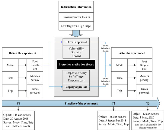 Therefore, this study introduces the protection motivation theory (PMT) framework and provides a field and follow-up experiment to evaluate car owners’ cognitive and emotional approaches to non-motorized travel when varying information about health and the environment is provided. Moreover, considering the potential role of smartphone technology in transport behavior [10], the WeChat software was used as the platform to conduct the information intervention experiments in this study. This software was chosen because it is the most popular communication platform in China with more than 1 billion active users in an average month [11]. The participants can also easily receive a piece of information/message in a real-world environment and their data are easier to track. In the experiment, a between-subjects design was introduced, and indicators of the mode, time, and trip were used to describe the details of travel behavioral change before and after information interventions. This study will provide insights into the theoretical and practical implications towards sustainable transportation under the guidelines of TDM strategies.