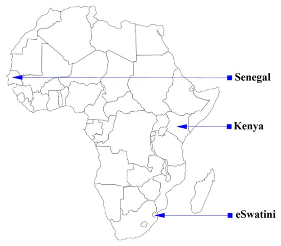 Sketch of Africa showing the location of Senegal (West Africa), Kenya (East Africa), and Eswatini (Southern Africa).