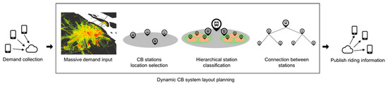 To offer a CB service, it is necessary to develop a system with dynamic CB planning. We provide an overview of the system in Figure 1. As the figure shows, first, passengers submit the traveling demand to the CB system. In the following steps, CB system gathers the massive demand data as the input of the system layout design and generates station location selection. For operation efficiency, the stations will be classified into a hierarchical structure and connected. Finally, the CB system will publish CB riding information to passengers and inform them of the location and time to get on the bus. In this planning system, the CB lines can be dynamic without fixed routes.